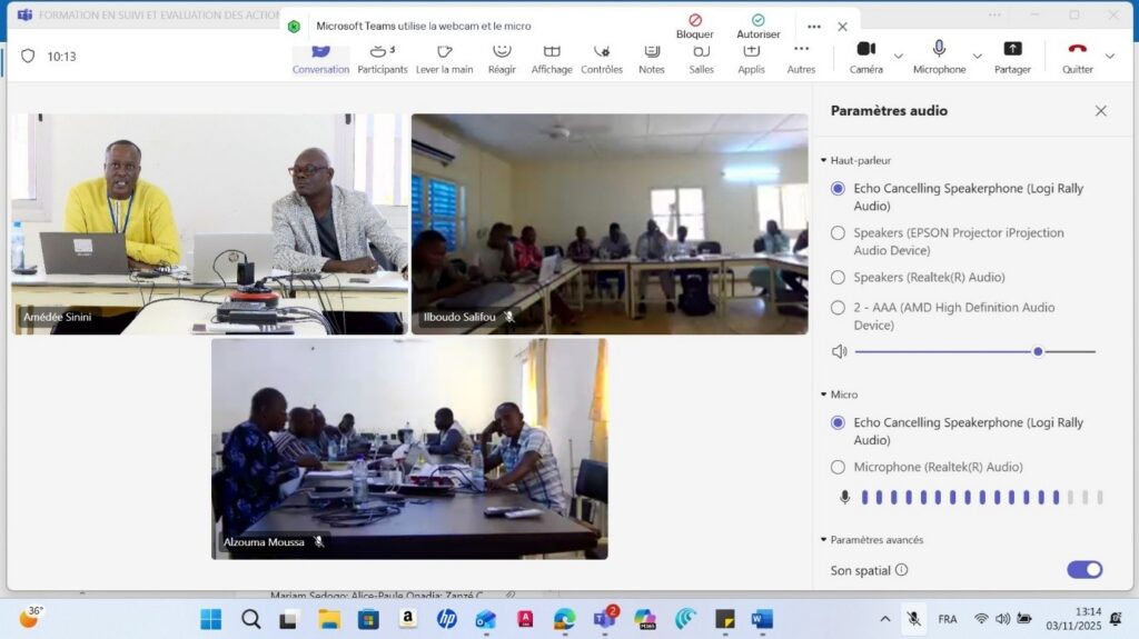 La formation en suivi et évaluation s’est faite de façon hybride, c’est-à-dire que les participants de Dori et Falagountou se sont regroupés dans la salle de réunion du projet à Dori et ceux de Gorom-Gorom dans la salle de visioconférence de la Mairie de Gorom-Gorom. Le formateur, quant à lui, est resté au bureau du projet ESEPV-Sahel à Ouagadougou et a pu dispenser sa formation à distance.